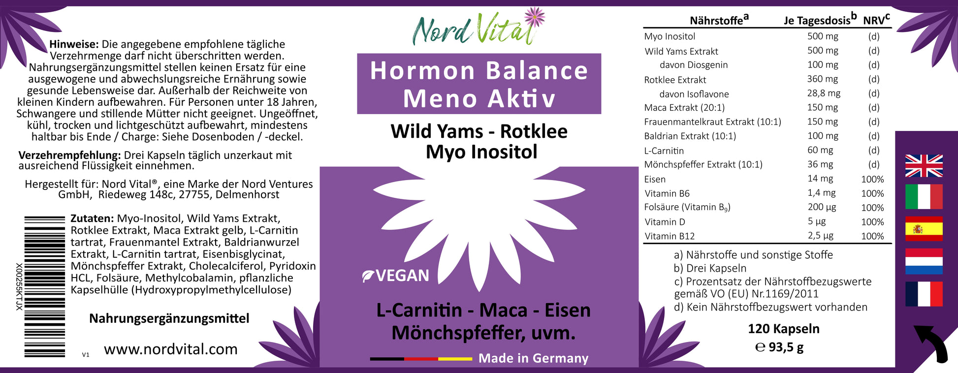 A carefully selected combination of 13 ingredients for women's well-being. Each capsule contains myo-inositol, wild yam (20% diosgenin), red clover (8% isoflavones), chaste tree , maca gold, lady's mantle, valerian, as well as valuable vitamins and iron.